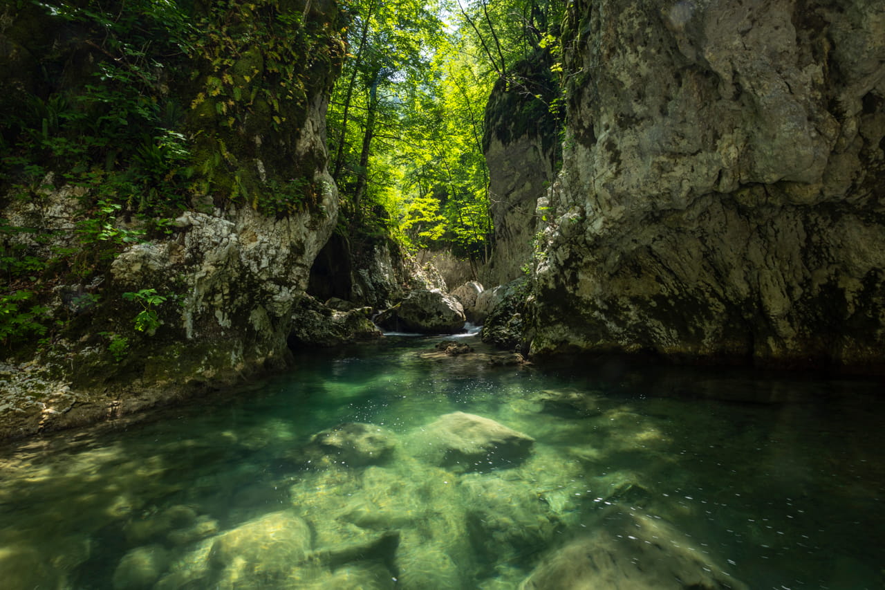 The river was mostly flowing slowly, but in the narrowest parts, I had to cling to the rocks on its banks to overcome the increasing current. After about 400 metres of “river climbing”, I came to a small rapid. The canyon walls were almost perpendicular to the river at that point, and I couldn’t go any further, but peering into the dark depths of Komarnica, my eyes started noticing the shapes of the limestone cliffs going all the way to the river bottom: it was amazing to witness the canyon stretching into the underwater world. To my surprise, two large chubs emerged from a hollow rock and swam in front of me. By then, I decided to let go of my grip and swim downstream, back to where I had entered the watercourse.