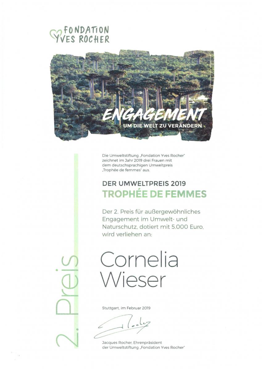 „Trophée de femmes“ ist ein Umweltpreis, der Frauen mit herausragendem Engagement für die Natur und Umwelt fördert. Die Umweltstiftung „Fondation Yves Rocher“ schreibt nach 15 Jahren den Umweltpreis jetzt erstmals im gesamten deutschsprachigen Raum – also in Deutschland, der deutschsprachigen Schweiz und Österreich – aus. Cornelia Wieser ist somit die erste österreichische Preisträgerin.