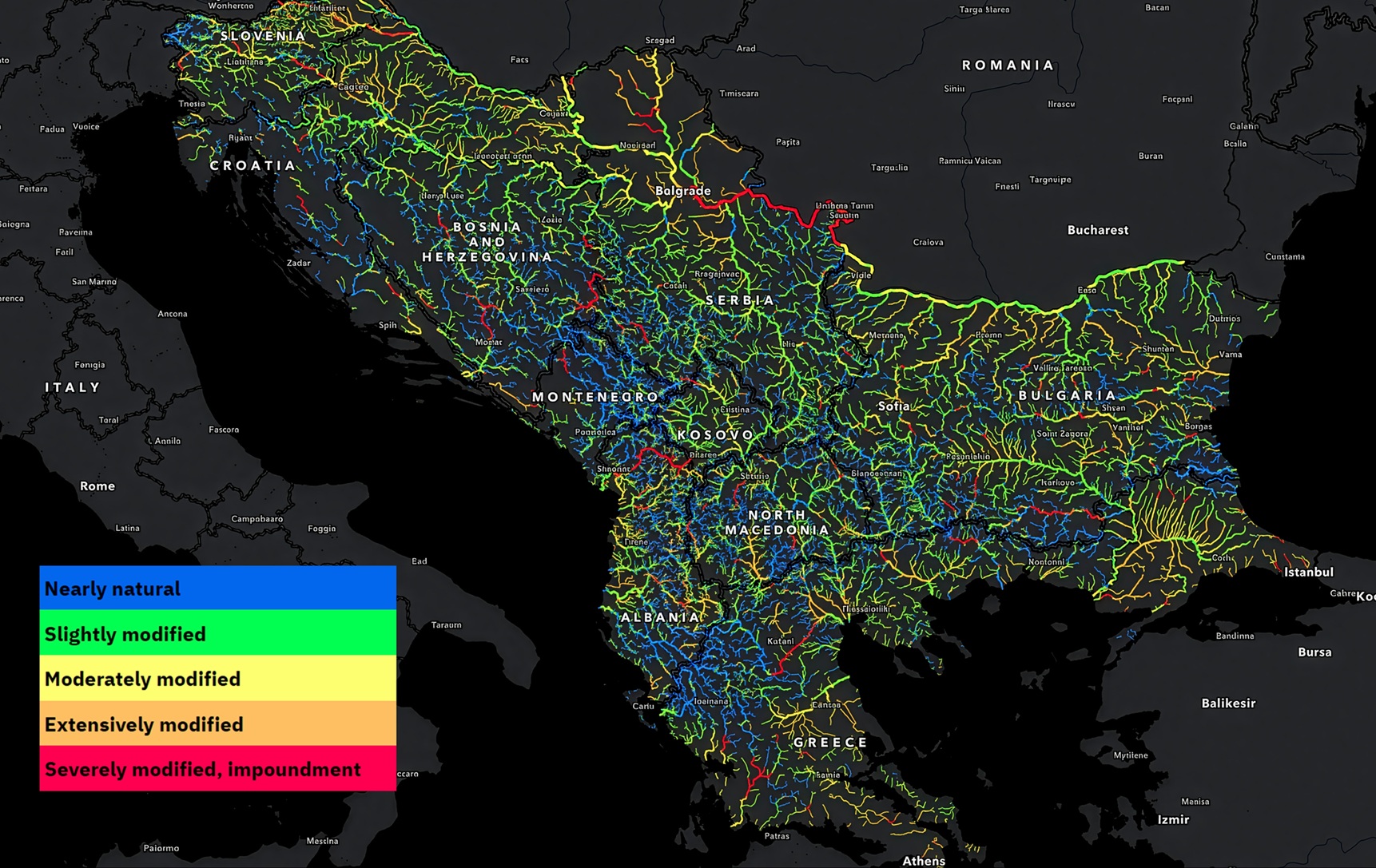 Of the larger rivers assessed, only 23% remain nearly natural, while 43% show slight modifications. Moderately to extensively modified rivers account for 27%, and severely modified stretches, primarily impoundments, represent 7% of the network. The most significant alterations were recorded on the Drina, Neretva, Vardar/Axios, Devoll, and Drin basins. Crucially, while this decline is alarming, the remaining percentages of nearly natural and slightly modified rivers remain significantly higher than in the rest of Europe, underscoring the Balkans' unique status as the continent's last major stronghold of pristine rivers.