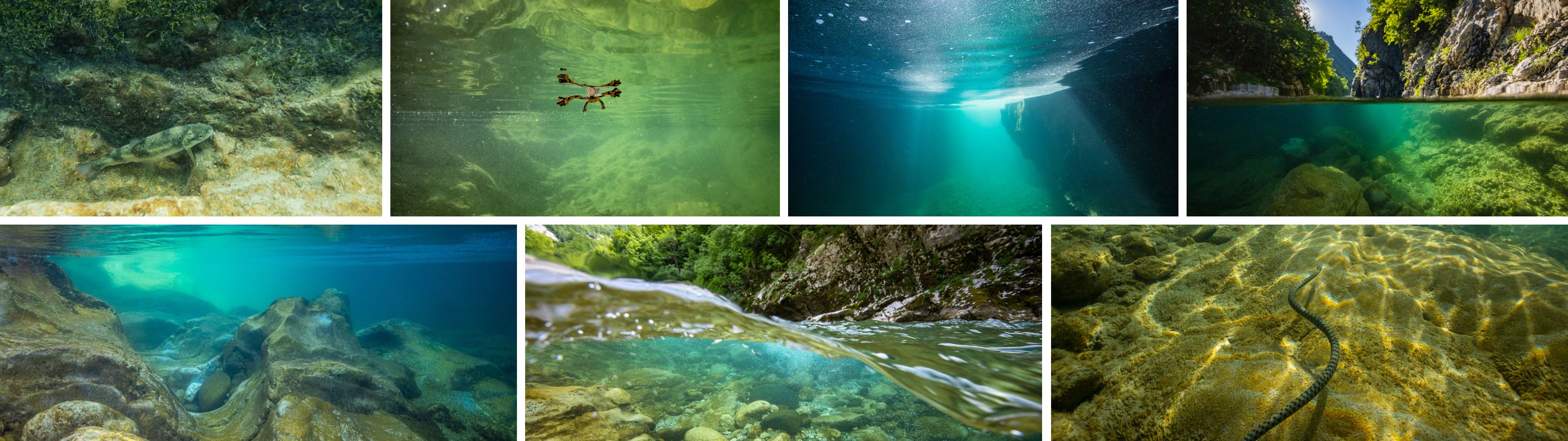 "Cold, damn' cold”, this is what I thought when I took the first plunge in mid-June. The waters of a mountain river are never warm, and the Komarnica makes no exception. Despite the warm temperatures outside, the river water was around 10° C, and I only had a short and thin wetsuit with me. Since the descent into the canyon is so long and tricky, and my photo equipment (including underwater housing) is so heavy, I could bring only the minimum. But as soon as I overcame the unease of the cold and the pull of the current, a breathtaking underwater scenery opened in front of my eyes. Beautifully carved stones and polished rocks of a yellow-ochre colour stood against the green-blue of the deeper water. Swift graylings and a few native brown trout bolted as I started making my way upstream.